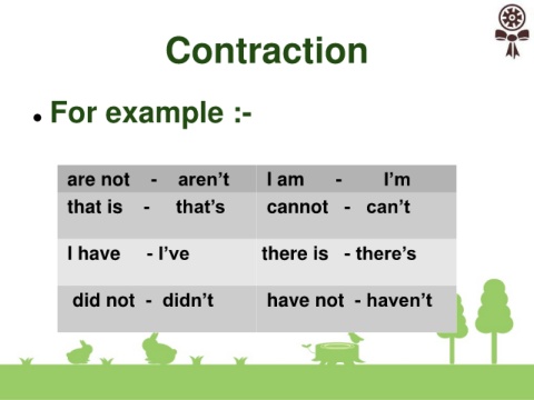 Contraction For example :- are not - aren’t I am - I’m that is - that’s cannot - can’t I have - I’ve there is - there’s did not - didn’t have not - haven’t