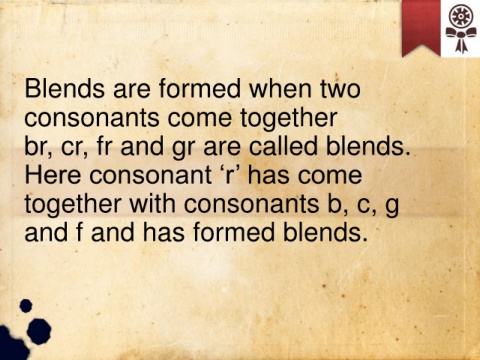Blends are formed when two consonants come together br, cr, fr and gr are called blends. Here consonant ‘r’ has come together with consonants b, c, g and f and has formed blends.