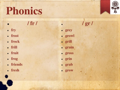 Phonics / fr / / gr / fry grey frost growl frock grill frill grain fruit gross frog grin friends grab fresh grow