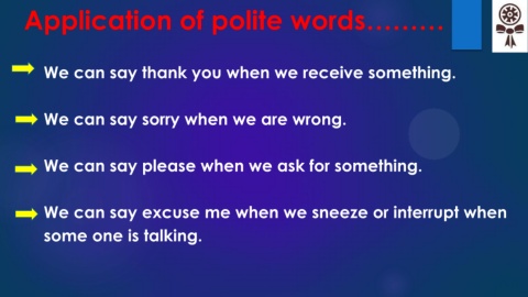 Application of polite words……… We can say thank you when we receive something. We can say sorry when we are wrong. We can say please when we ask for something. We can say excuse me when we sneeze or interrupt when some one is talking.