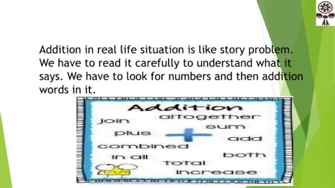Addition in real life situation is like story problem. We have to read it carefully to understand what it says. We have to look for numbers and then addition words in it.