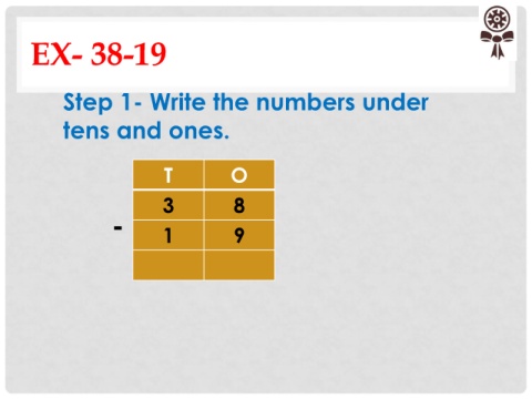 EX- 38-19 Step 1- Write the numbers under tens and ones. T O 3 8 - 1 9