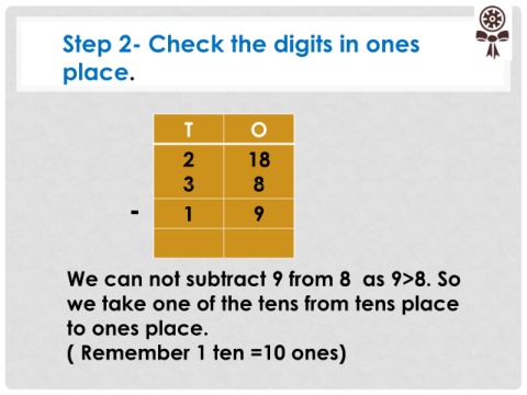 Step 2- Check the digits in ones place. T O 2 18 3 8 - 1 9 We can not subtract 9 from 8 as 9>8. So we take one of the tens from tens place to ones place. ( Remember 1 ten =10 ones)