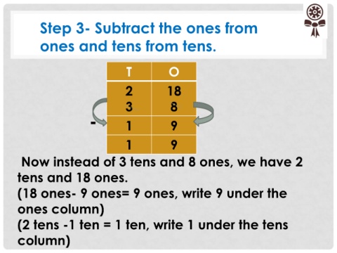 (18 ones- 9 ones= 9 ones, write 9 under the