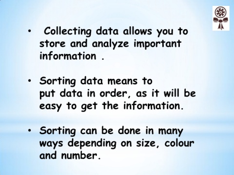 • Collecting data allows you to store and analyze important information . • Sorting data means to put data in order, as it will be easy to get the information. • Sorting can be done in many ways depending on size, colour and number.