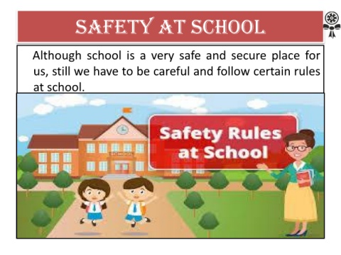 SAFETY AT SCHOOL Although school is a very safe and secure place for us, still we have to be careful and follow certain rules at school.