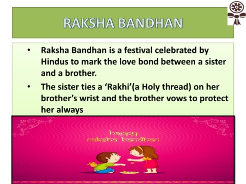 • Raksha Bandhan is a festival celebrated by Hindus to mark the love bond between a sister and a brother. • The sister ties a ‘Rakhi’(a Holy thread) on her brother’s wrist and the brother vows to protect her always