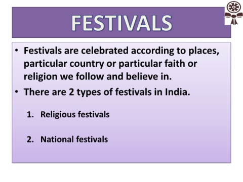 • Festivals are celebrated according to places, particular country or particular faith or religion we follow and believe in. • There are 2 types of festivals in India. 1. Religious festivals 2. National festivals