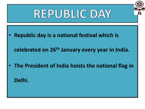 • Republic day is a national festival which is th celebrated on 26 January every year in India. • The President of India hoists the national flag in Delhi.