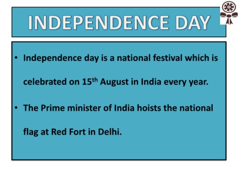 • Independence day is a national festival which is th celebrated on 15 August in India every year. • The Prime minister of India hoists the national flag at Red Fort in Delhi.