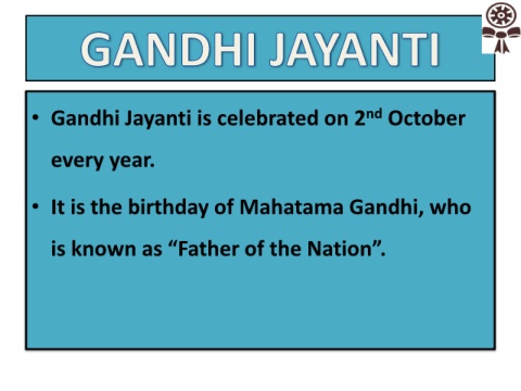 nd • Gandhi Jayanti is celebrated on 2 October every year. • It is the birthday of Mahatama Gandhi, who is known as “Father of the Nation”.