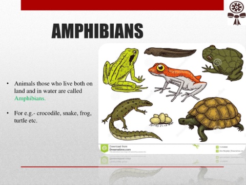 AMPHIBIANS • Animals those who live both on land and in water are called Amphibians. • For e.g.- crocodile, snake, frog, turtle etc.