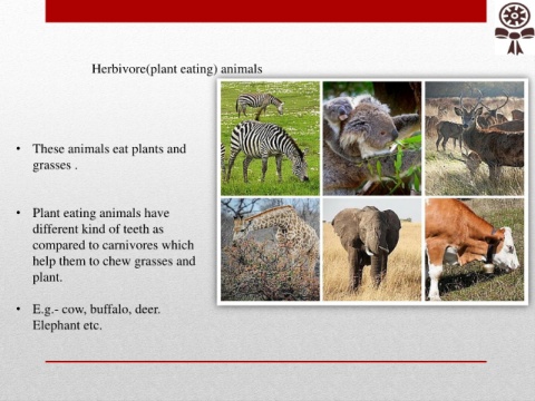 Herbivore(plant eating) animals • These animals eat plants and grasses . • Plant eating animals have different kind of teeth as compared to carnivores which help them to chew grasses and plant. • E.g.- cow, buffalo, deer. Elephant etc.