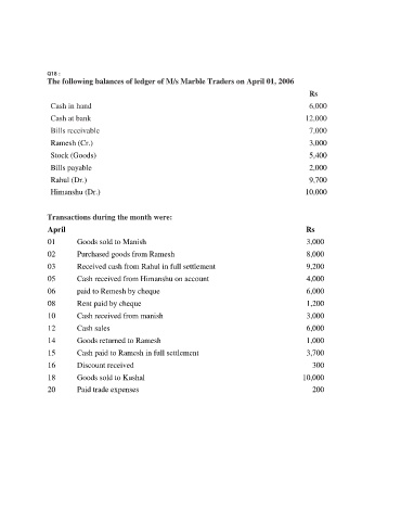 The following balances of ledger of M/s Marble Traders on April 01, 2006