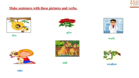 Make sentences with these pictures and verbs. give live work eat swallow take