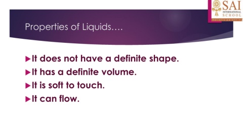Properties of Liquids…. It does not have a definite shape. It has a definite volume. It is soft to touch. It can flow.