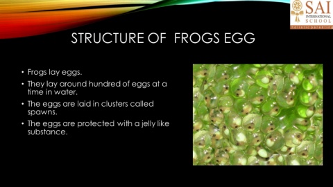 STRUCTURE OF FROGS EGG • Frogs lay eggs. • They lay around hundred of eggs at a time in water. • The eggs are laid in clusters called spawns. • The eggs are protected with a jelly like substance.