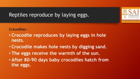 Reptiles reproduce by laying eggs. Crocodiles – • Crocodile reproduces by laying eggs in hole nests. • Crocodile makes hole nests by digging sand. • The eggs receive the warmth of the sun. • After 80-90 days baby crocodiles hatch from the eggs.