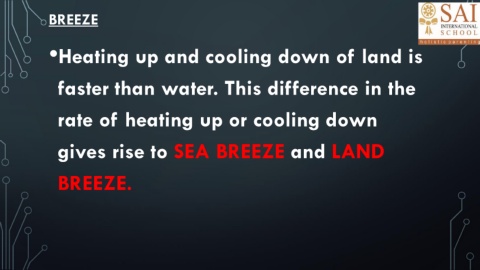 BREEZE •Heating up and cooling down of land is faster than water. This difference in the rate of heating up or cooling down gives rise to SEA BREEZE and LAND BREEZE.