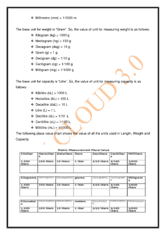 The base unit for capacity is “Litre”. So, the value of unit for measuring capacity is as