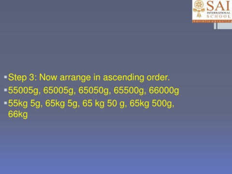 Step 3: Now arrange in ascending order. 55005g, 65005g, 65050g, 65500g, 66000g 55kg 5g, 65kg 5g, 65 kg 50 g, 65kg 500g, 66kg