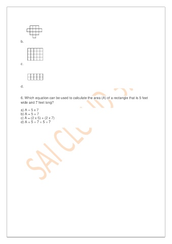 b. c. d. 6. Which equation can be used to calculate the area (A) of a rectangle that is 5 feet wide and 7 feet long? a) A = 5 x 7 b) A = 5 + 7 c) A = (2 x 5) + (2 x 7) d) A = 5 + 7 + 5 + 7