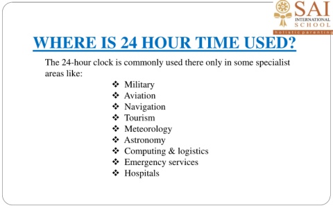 WHERE IS 24 HOUR TIME USED? The 24-hour clock is commonly used there only in some specialist areas like: ❖ Military ❖ Aviation ❖ Navigation ❖ Tourism ❖ Meteorology ❖ Astronomy ❖ Computing & logistics ❖ Emergency services ❖ Hospitals