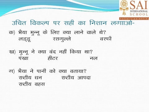 mfpr fodYi ij lgh dk fu’kku yxkkvks& w d½ HkS;k eqUu ds fy, D;k ykus okys Fks\ yM~Mw jlxqYys cjQh [k½ eqUuw us D;k can ugha fd;k Fkk\ ia[kk ghVj uy x½ HkS;k us ikuh dks D;k crk;k\ jk”Vh; /ku jk”Vh; vkink jk”Vh; cgl