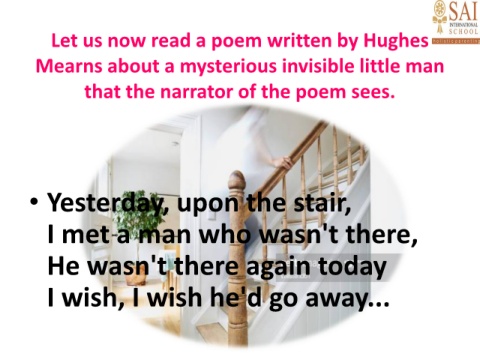 Let us now read a poem written by Hughes Mearns about a mysterious invisible little man that the narrator of the poem sees. • Yesterday, upon the stair, I met a man who wasn't there, He wasn't there again today I wish, I wish he'd go away...