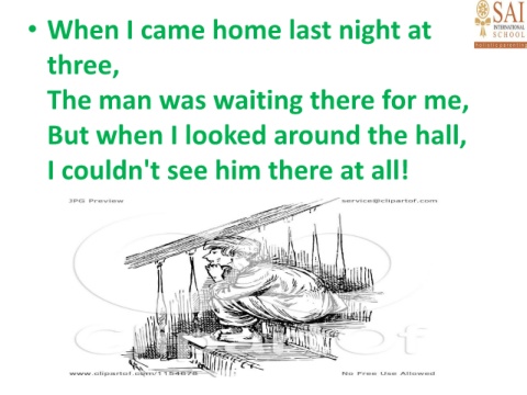 • When I came home last night at three, The man was waiting there for me, But when I looked around the hall, I couldn't see him there at all!