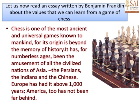 Let us now read an essay written by Benjamin Franklin about the values that we can learn from a game of chess.