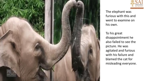 The elephant was furious with this and went to examine on his own. To his great disappointment he also failed to see the picture. He was agitated and furious with his failure and blamed the cat for misleading everyone.