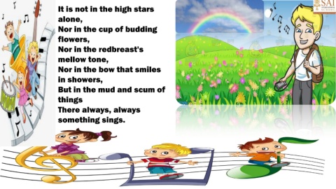 It is not in the high stars alone, Nor in the cup of budding flowers, Nor in the redbreast's mellow tone, Nor in the bow that smiles in showers, But in the mud and scum of things There always, always something sings.