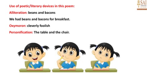 Use of poetic/literary devices in this poem: Alliteration: beans and bacons We had beans and bacons for breakfast. Oxymoron: cleverly foolish Personification: The table and the chair.