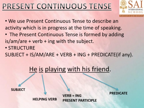 SUBJECT + IS/AM/ARE + VERB + ING + PREDICATE(if any).