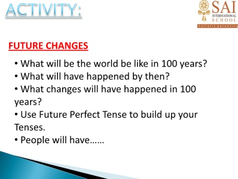 FUTURE CHANGES • What will be the world be like in 100 years? • What will have happened by then? • What changes will have happened in 100 years? • Use Future Perfect Tense to build up your Tenses. • People will have……