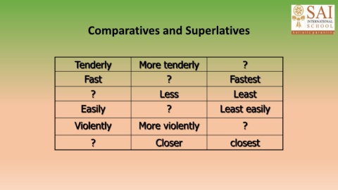 Comparatives and Superlatives Tenderly More tenderly ? Fast ? Fastest ? Less Least Easily ? Least easily Violently More violently ? ? Closer closest