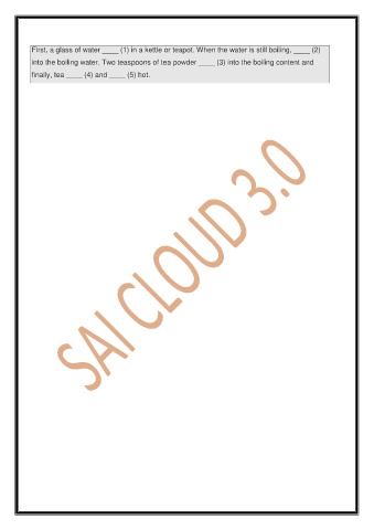 First, a glass of water ____ (1) in a kettle or teapot. When the water is still boiling, ____ (2) into the boiling water. Two teaspoons of tea powder ____ (3) into the boiling content and finally, tea ____ (4) and ____ (5) hot.