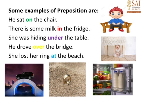 Some examples of Preposition are: He sat on the chair. There is some milk in the fridge. She was hiding under the table. He drove over the bridge. She lost her ring at the beach.
