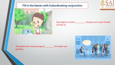 Fill in the blanks with Subordinating conjunction Sara begins to sneeze _________ she goes out to get a breath of fresh air. The people were listening eagerly ________ the leader was speaking.