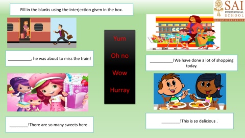 Fill in the blanks using the interjection given in the box. Yum Oh no __________, he was about to miss the train! __________!We have done a lot of shopping today. Wow Hurray ________!This is so delicious . ________!There are so many sweets here .