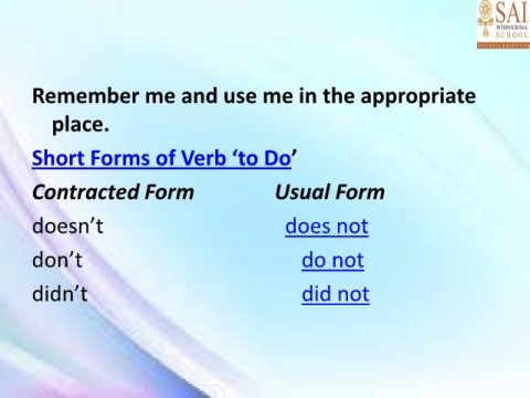 Remember me and use me in the appropriate place. Short Forms of Verb ‘to Do’ Contracted Form Usual Form doesn’t does not don’t do not didn’t did not