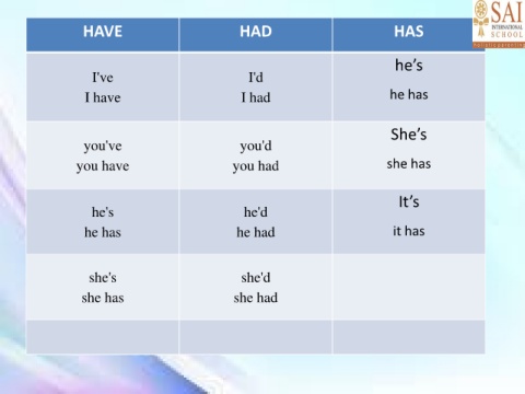 HAVE HAD HAS he’s I've I'd I have I had he has She’s you've you'd you have you had she has It’s he's he'd he has he had it has she's she'd she has she had