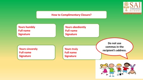 How to Complimentary Closure? Yours humbly Yours obediently Full name Full name Signature Signature Do not use commas in the Yours sincerely Yours truly recipient’s address. Full name Full name Signature Signature