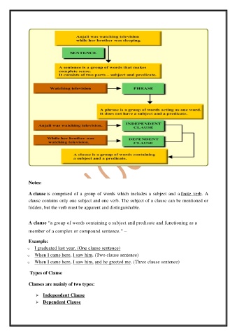A clause is comprised of a group of words which includes a subject and a finite verb. A
