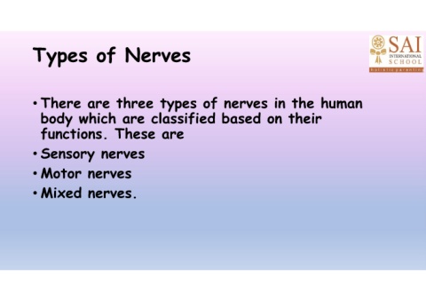 Types of Nerves • There are three types of nerves in the human body which are classified based on their functions. These are • Sensory nerves • Motor nerves • Mixed nerves.