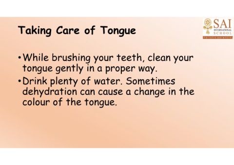 Taking Care of Tongue •While brushing your teeth, clean your tongue gently in a proper way. •Drink plenty of water. Sometimes dehydration can cause a change in the colour of the tongue.