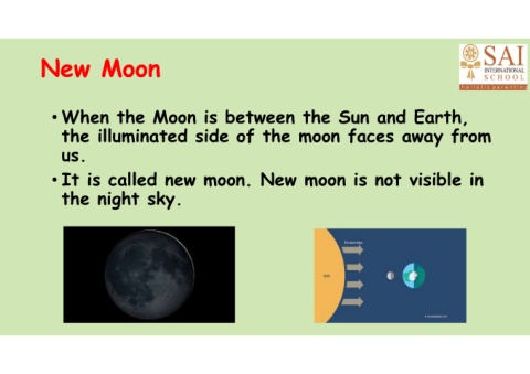 New Moon • When the Moon is between the Sun and Earth, the illuminated side of the moon faces away from us. • It is called new moon. New moon is not visible in the night sky.