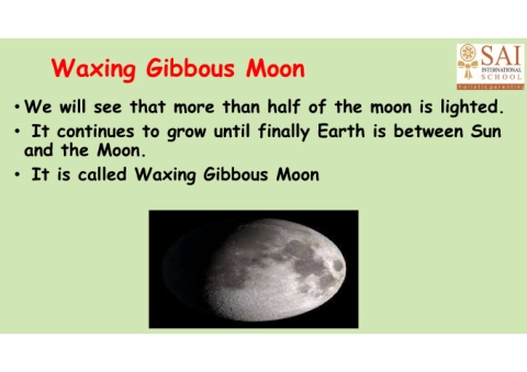Waxing Gibbous Moon • We will see that more than half of the moon is lighted. • It continues to grow until finally Earth is between Sun and the Moon. • It is called Waxing Gibbous Moon