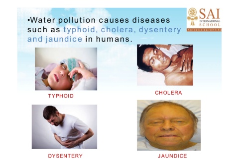 •Water pollution causes diseases such as typhoid, cholera, dysentery and jaundice in humans. CHOLERA TYPHOID DYSENTERY JAUNDICE